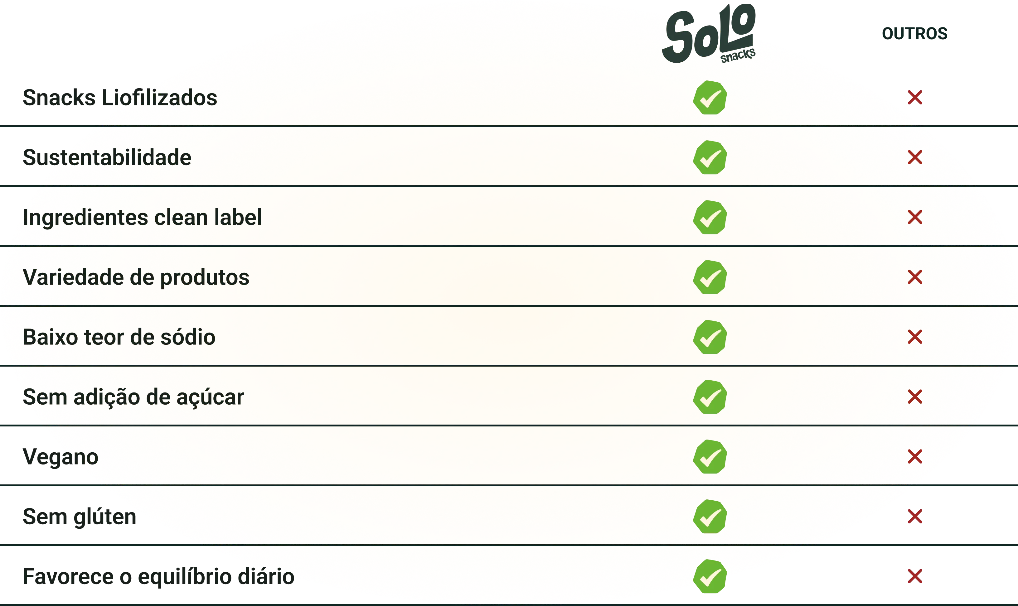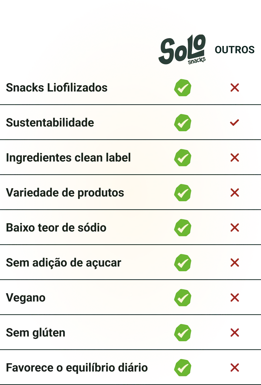 Cada Solo Snacks é feito com ingredientes naturais e tecnologia que preserva nutrientes, energia e bem-estar em cada mordida.